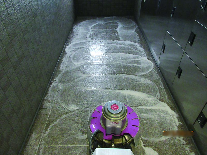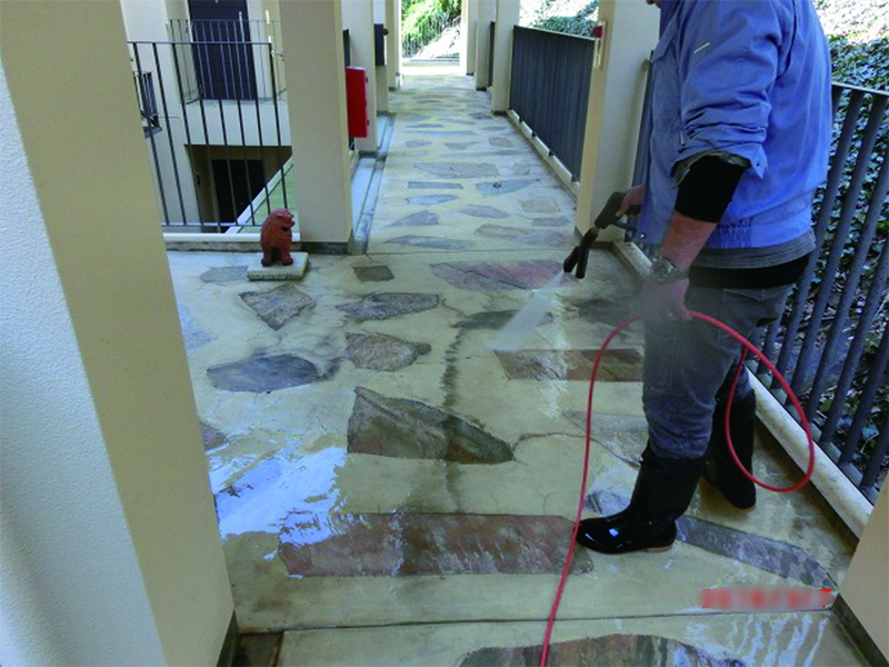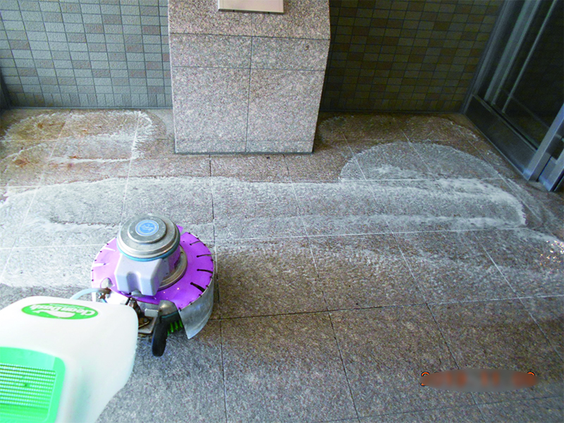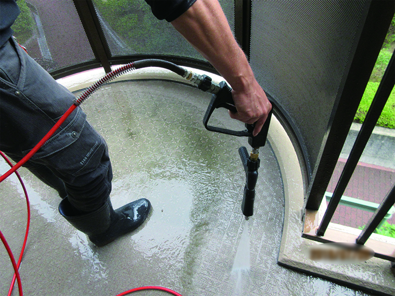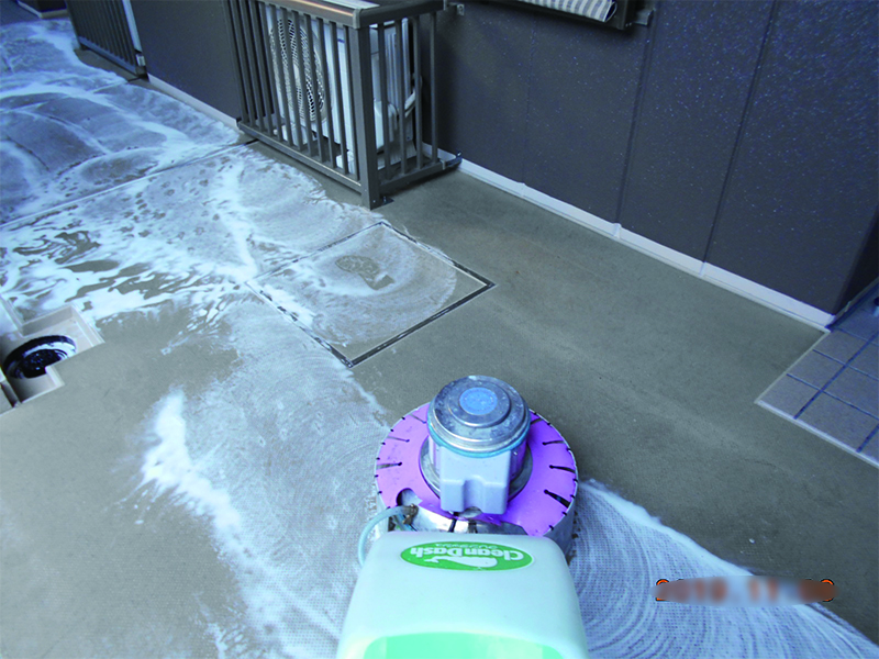 定期清掃では、高圧洗浄機やポリッシャーを使用して、廊下や階段、ゴミ捨て場などの共有部分や、たくさんの人が利用する場所では床のワックスが剥がれ汚くなっている部分の剝離作業などを行い、